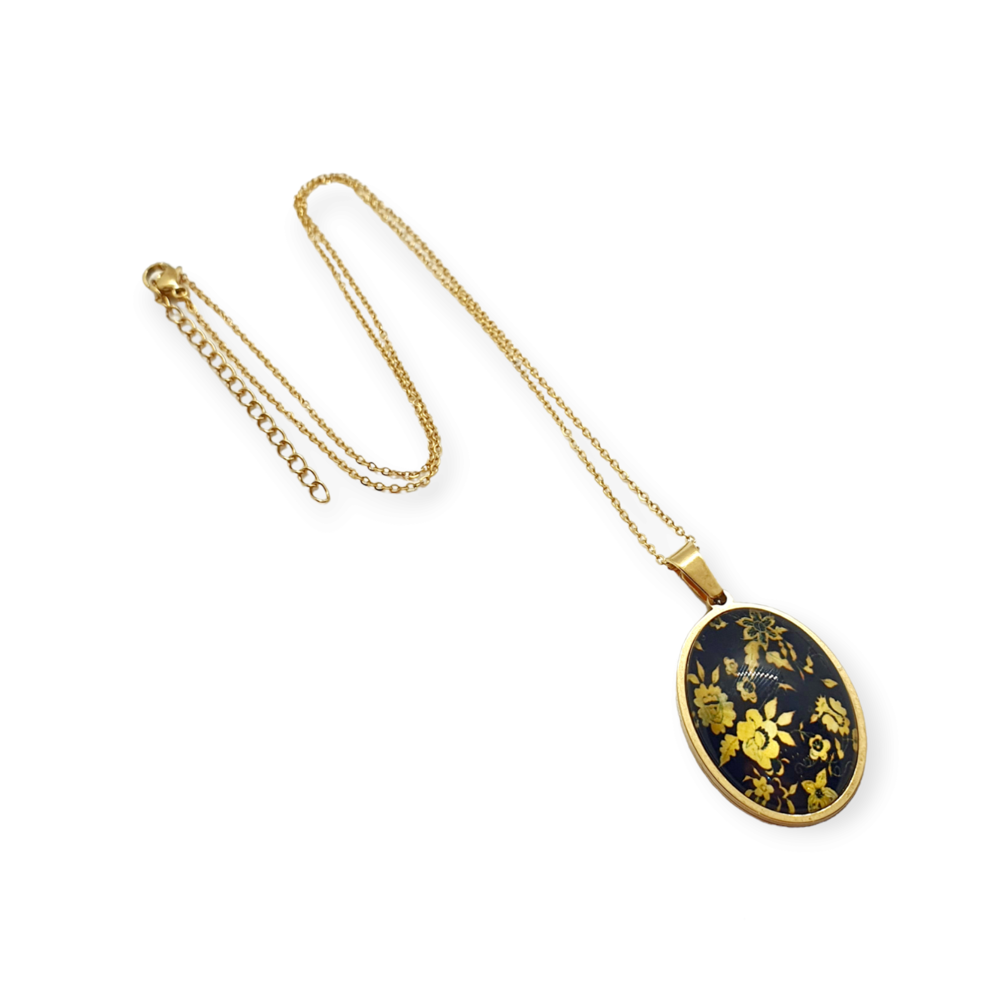 Κολιέ με ατσάλινη χρυσή κοντή αλυσίδα 44εκατοστών και 5εκατοστά επέκταση. Αποτελείται από ατσάλινο χρυσό οβάλ βάση 18*25mm, είναι φτιαγμένο με υγρό γυαλί και απεικονίζει χρυσά λουλούδια σε μαύρο φόντο.