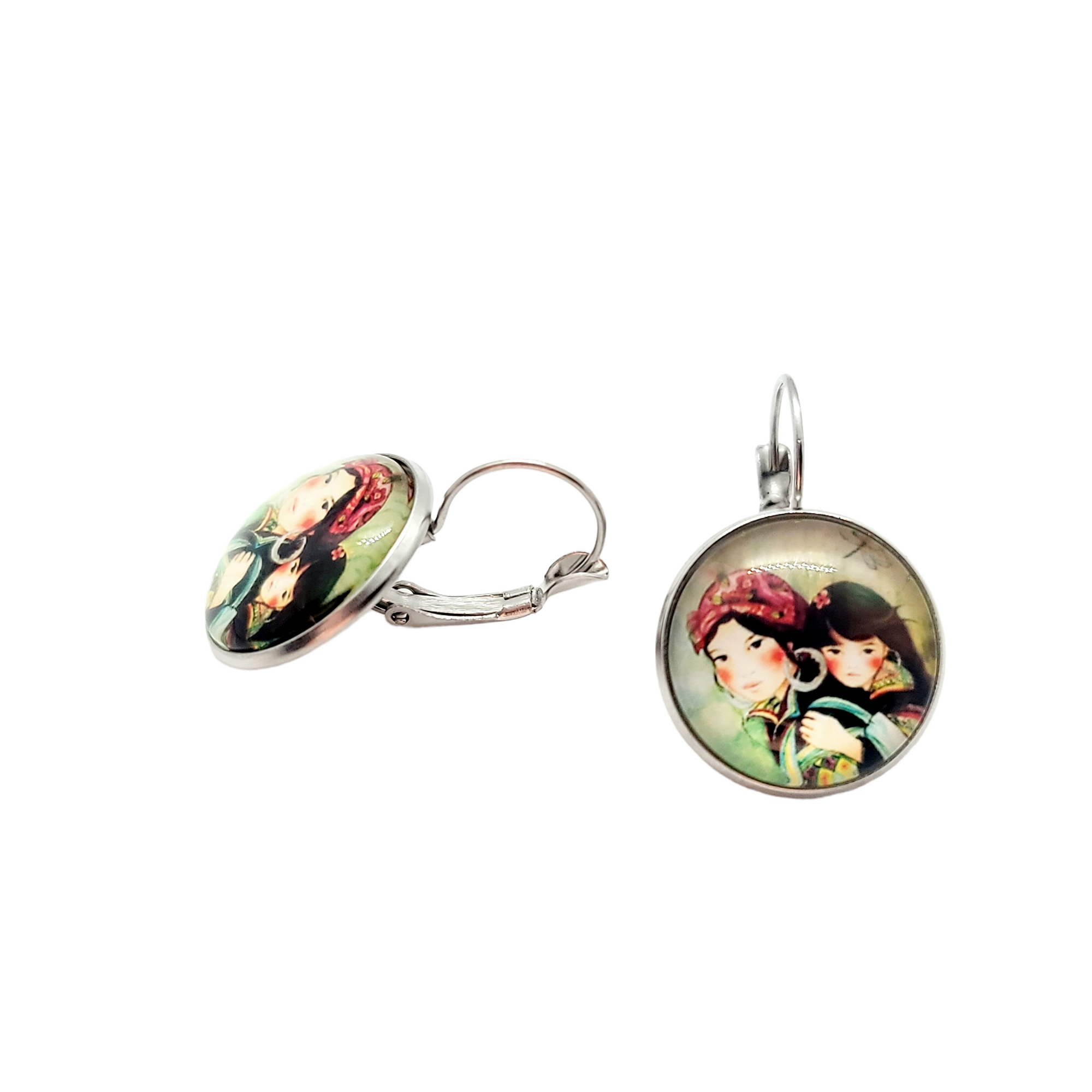 • Χειροποίητα ατσάλινα κρεμαστά σκουλαρίκια σε ασημί χρώμα με ασφαλές κούμπωμα. Είναι φτιαγμένα με υγρό γυαλί και αναπαριστούν μία μητέρα που στην πλάτη της έχει την μικρή της κόρη. Διάμετρος κύκλου 18mm.