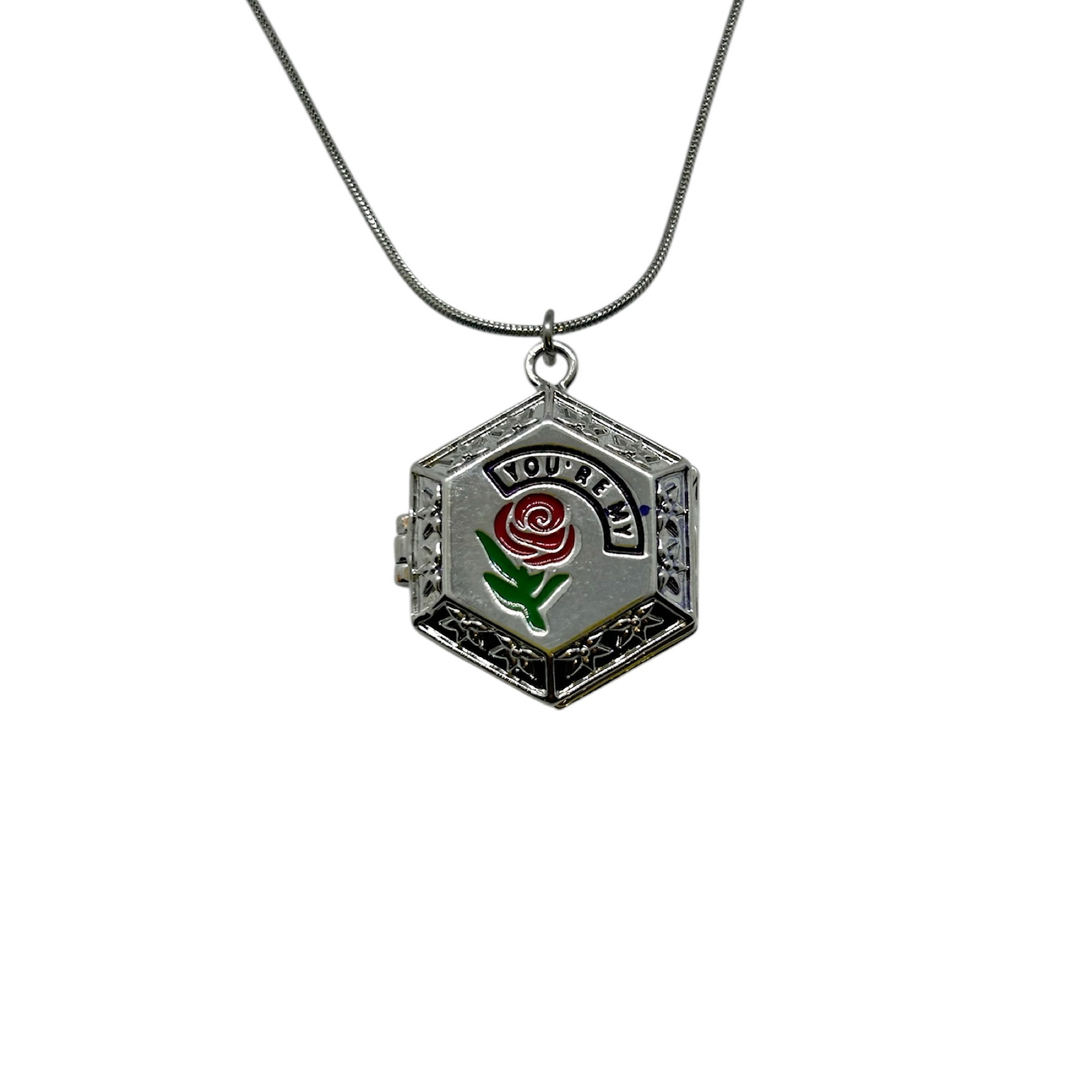Necklace with a silver colored steel chain, 45cm long and 5cm extension and an openable copper, polygonic where it is written "you are my rose".