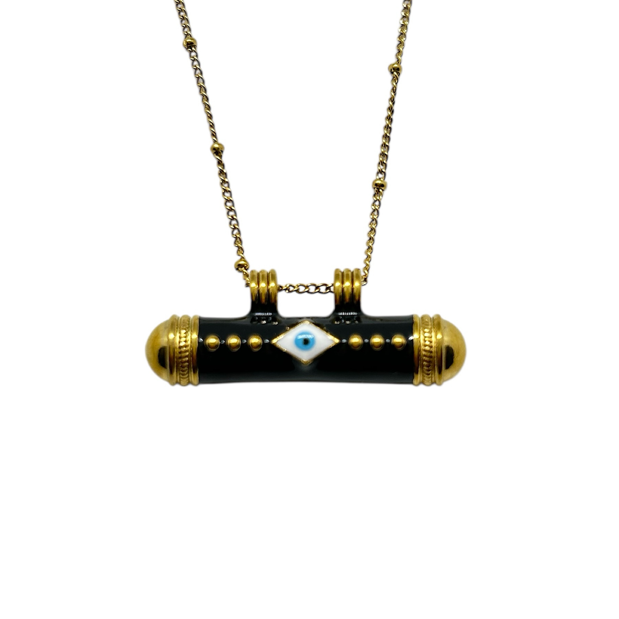 Gold-colored steel necklace, 45cm long and 5cm extension and narrow eye with black enamel, dimensions 4*1,5cm.