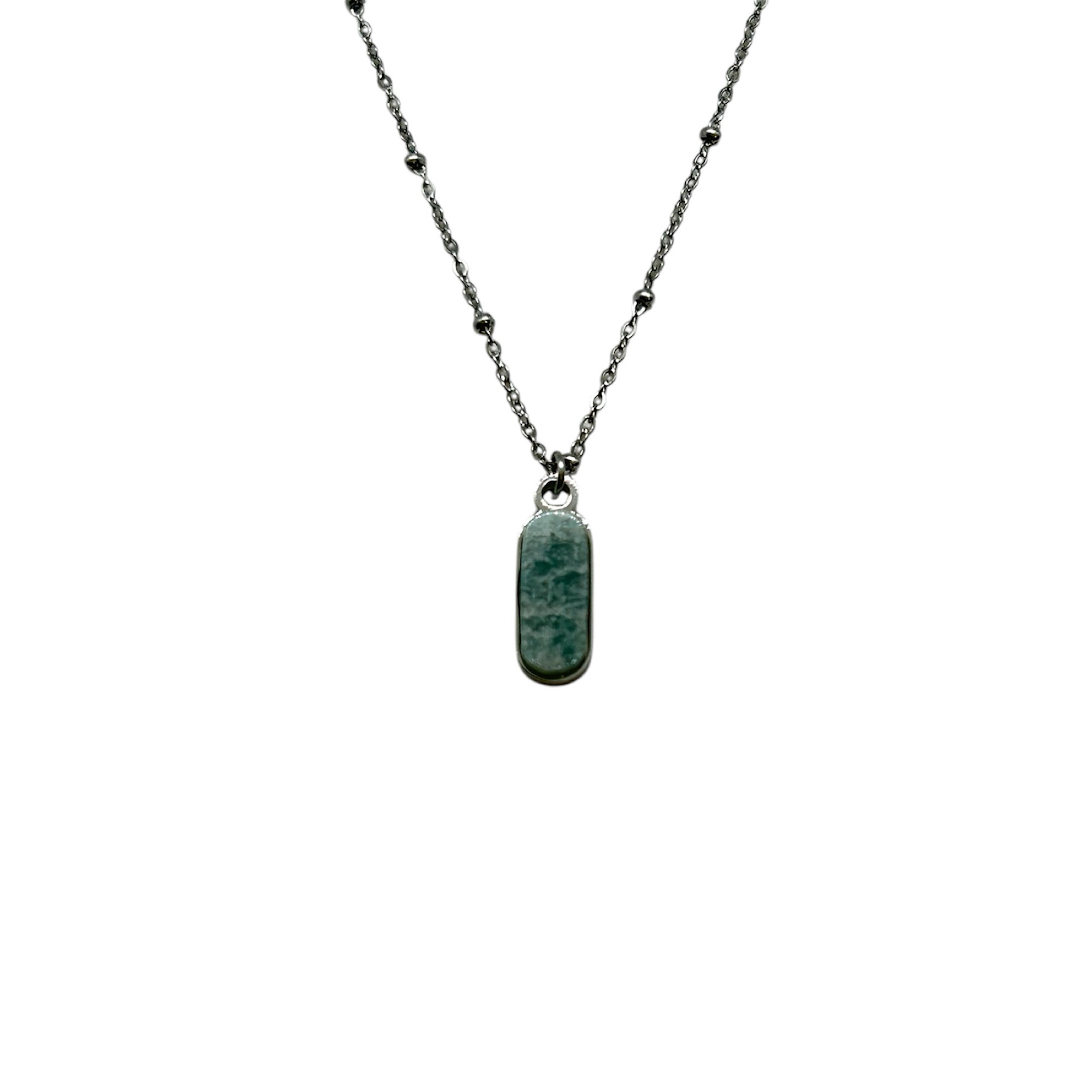 Product details 16,00 € In Stock SKU: 715 Silver steel necklace with rectangular natural stone. Add to Wishlist Add to Compare Back to: Necklaces Description Necklace with a silver steel chain, 45cm long and 5cm extension and a rectagular natural stone in light blue, dimensions 16*2cm.